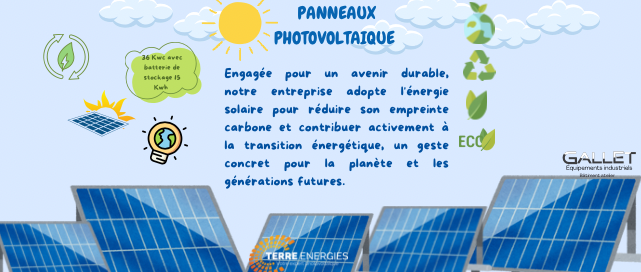 Dans une démarche responsable et tournée vers l’avenir, Gallet Équipements Industriels s’engage dans la transition énergétique en adoptant l’énergie solaire.