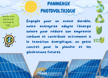 Avec une installation de 36 kWc accompagnée d’une batterie de stockage de 15 kWh, notre entreprise réduit significativement son empreinte carbone tout en assurant une autonomie énergétique partielle. Ce choix s’inscrit dans notre volonté de participer activement à un avenir plus durable et respectueux de l’environnement.